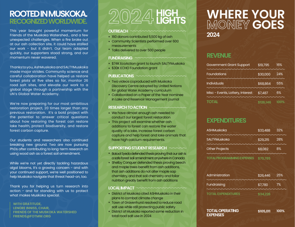 Maple sap production is a signature industry in the mixed hardwood forests of eastern Canada, including Muskoka, but trees in sugar bushes are currently not as healthy or productive as they could be. Why? Because decades of acid deposition stripped nutrients, especially calcium, from the soil in sugar bushes. While we have shown that residential firewood ashes restore soil chemistry and foliar nutrition without leading to metal contamination of trees, we didn’t know what would happen to maple sap production rates, sweetness or chemistry. To test this, FOTMW staff and Trent U students tapped a dozen sugar maple on ash-treated and control plots at Camp Big Canoe for two spring sap flow seasons. The results were worked up by MSc student Shelby Conquer, and they were positive. Sap volume increased one year after ash addition, with no reduction in sweetness. This benefit lasted only the first year however, and there were no other consistent differences in sap chemistry between treated and control plots. This suggests that residential firewood ash is a viable nutrient supplement that can enhance soil fertility in likely tree growth and health in sugar bushes with no detrimental impacts on sap sweetness.